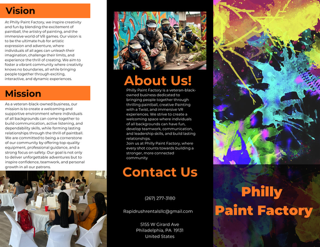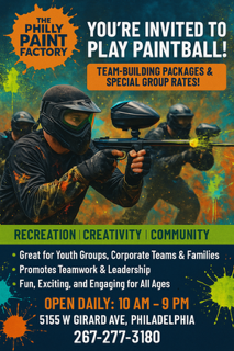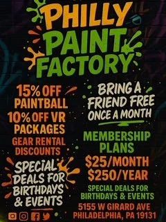 At The Philly Paint Factory, we inspire creativity and fun by blending the excitement of paintball, the artistry of painting, and the immersive world of VR games. Our Vision is to be the ultimate hub for artistic expression and adventure, where individuals of all ages can unleash their imagination, challenge their limits, and experience the thrill of creating. We aim to foster a vibrant community where creativity knows no boundaries, all while bringing people together through exciting, interactive, and dynamic experiences.